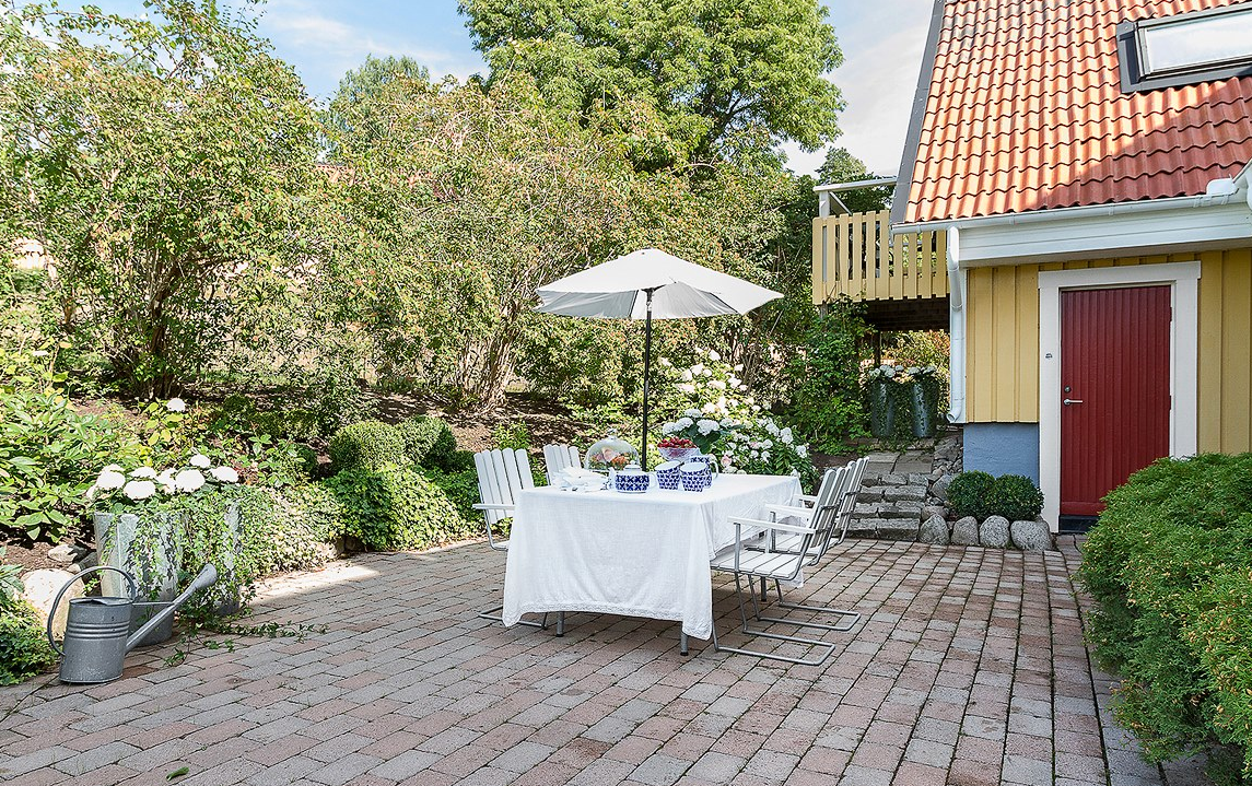 Efter att vi var klara med altanen satte vi igång med stensättningen. Som ni kan se på bilden är den största delen av uteplatsen stenbelagd med plats för matbord och omringat av fina buskar. Vi köpte även flera naturstenar som vi satte utanför dörren och byggde en liten trappa som går under balkongen. Det var ganska enkelt med stenläggningen, då vi redan hade en lämplig plan markyta som var aningen hård sen innan. Vi la ut lite grus, istället för sand och jord för vi hade hört att det kan orsaka lös mark efter ett par år. Vi fick hjälp från en vän som skötte själva stensättningen av marksten, vilket ni kan se blev väldigt fint!